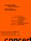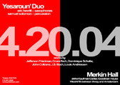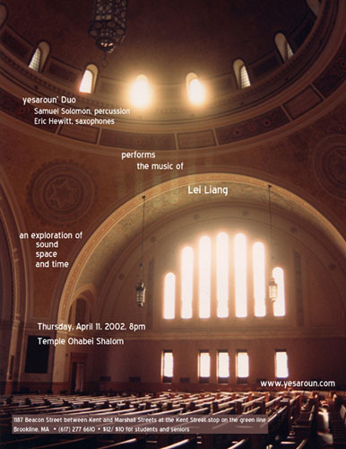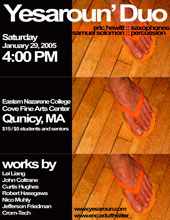 Tuesday, November 15, 2005 8pm 2004 February 21, 2004 8pm John Knowles Paine Hall at Harvard University Cambridge, MA as part of the Harvard Group for New Music Admission is free Concert of works written for Yesaroun' by Harvard composers.