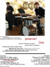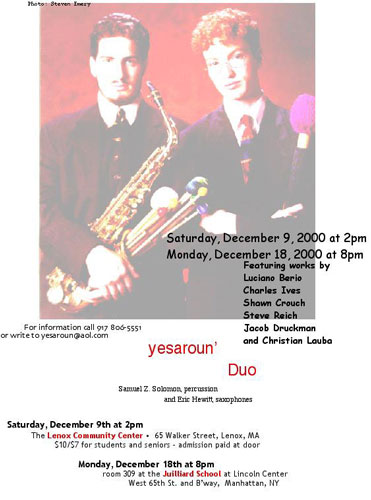 Friday, April 13, 3-5pm Samuel Z. Solomon masterclass Boston Conservatory featuring Yesaroun' Duo with Shawn Crouch's Suspended Contact Also featuring Georges Aperghis' Le Corps á Corps Saturday, April 14 at 8pm Yesaroun' Duo John Knowles Paine Concert Hall, Harvard University Harvard Group for New Music Admission is free Performing Ken Ueno's WATT For further infromation, please contact the Music Department at Harvard at 617-495-2791 For directions and a link to a map: http://fas-www.harvard.edu/~musicdpt/parking.html Wednesday, May 9, 2001 Cantors Assembly Convention The Neveleh in Ellenville, NY Performing works by Cantor Robert Solomon Thursday, May 10, 2001 at 8pm Jordan Hall, New England Conservatory 290 Huntington Ave., Boston, MA Free! no tickets required Performing the world premiere of July 10-13, 2001 Yesaroun' Duo will be Ensemble in Residence at the Walden School, Dublin, NH Friday July 13, 2001 at 8pm Louise Shonk Kelly Recital Hall Dublin School, Dublin, NH