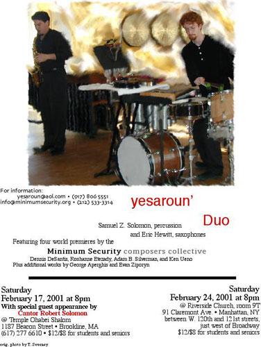 2001 Tuesday, January 16, 2001 Longmeadow High School, Longmeadow Massachusetts Two lecture demonstrations for the Longmeadow High music department, Michael Mucci, director 9:48 - 10: 44am and 10:48 - 11:44am Featuring works by Steve Reich, Shawn Crouch, Christian Lauba and G. H. Green Monday, February 12 at 12pm Hear the Yesaroun' Duo interviewed on "Monday Afternoon Classics with Gandalf" WJFF (an NPR affiliate) 90.5 FM in Jeffersonville, NY and 94.5 FM in Monticello, NY Three city, three concert tour featuring the Minimum Security composers collective Dennis DeSantis, Adam B. Silverman, Roshanne Etezady and Ken Ueno These four pieces were written for the Yesaroun' Duo and are receiving their world premiere performances on these three concerts. Sunday, February 11th 2001 at 2pm